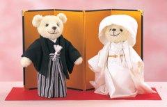白無垢に綿帽子の和装のくまさんです。ペアで1キット。※別売品:金屏風4007、もうせん小、PC-9プラケース。※完成品は10日ほどお時間をいただく場合がございます。