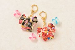 金ボール紙・ちりめん(柄赤・柄ピンク・白・黒・黄・黄緑)、スチボール、紐、刺し目、金ビーズ、キーホルダー金具