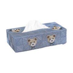 パナミメタリックヤーンで作る、アニマルティッシュカバー。別に作ったいぬのモチーフをかがり付けるだけで、かわいいティッシュカバーが出来上がります。※キャンバス型抜き済