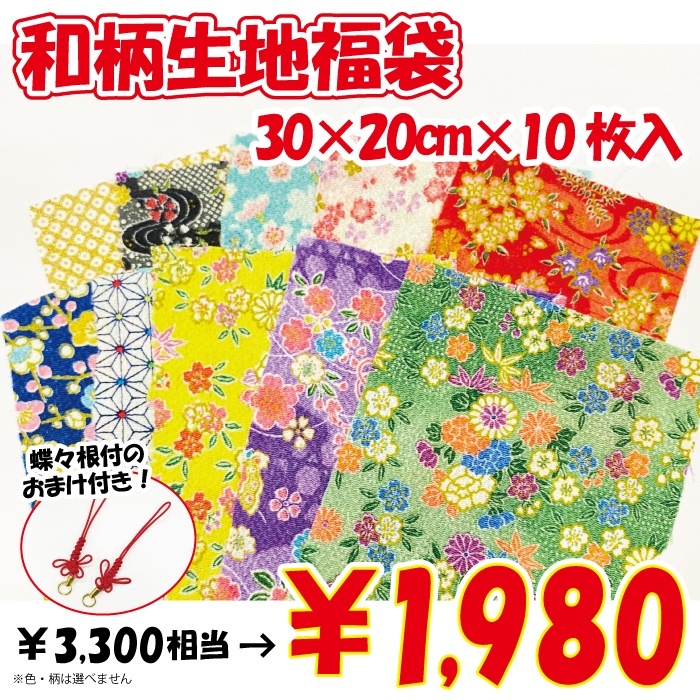 【2026年福袋】和柄の生地(30cm×20cm)10枚入り 3300円相当が1980円! 蝶々根付付き